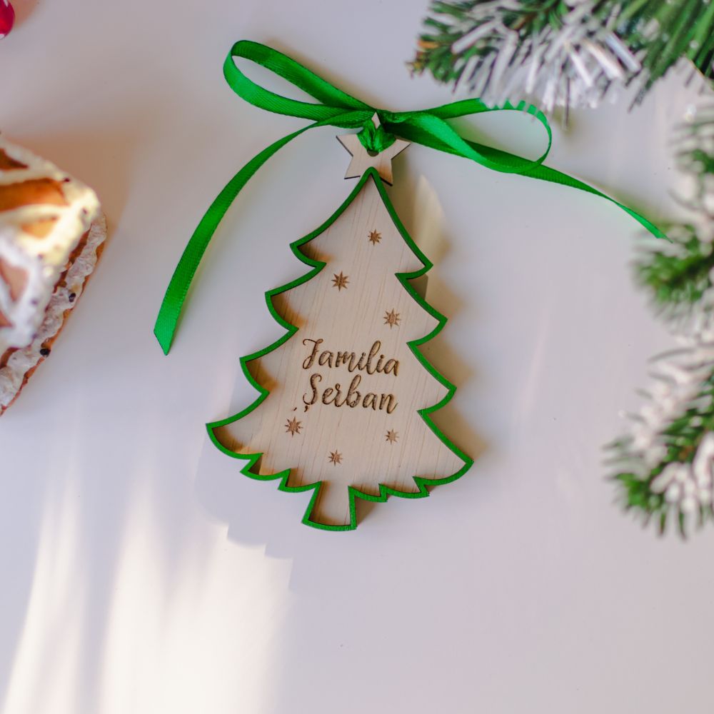 Un bradut frumos si bine lucrat. Am ales varianta personalizata cu numele de familie si am adaugat si bradutii cu prenumele noastre, iar totul arata minunat impreuna.