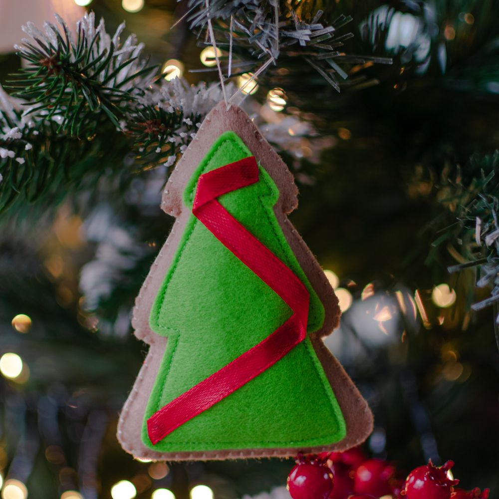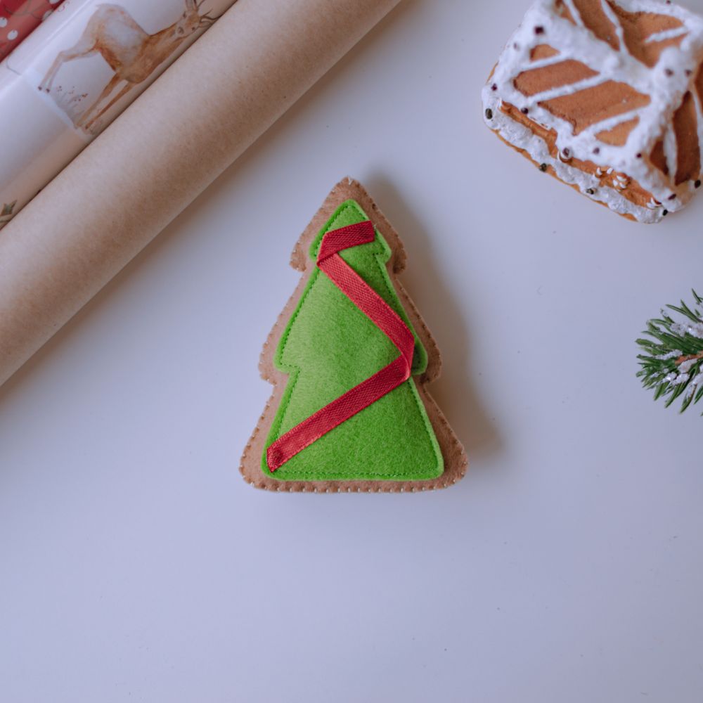 Design Festiv: Brăduțul verde, cu detalii brodate și panglică roșie, aduce un farmec clasic și elegant bradului tău.