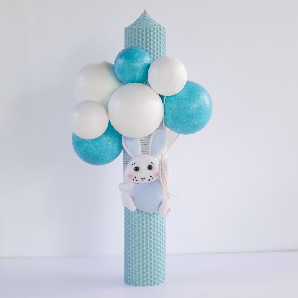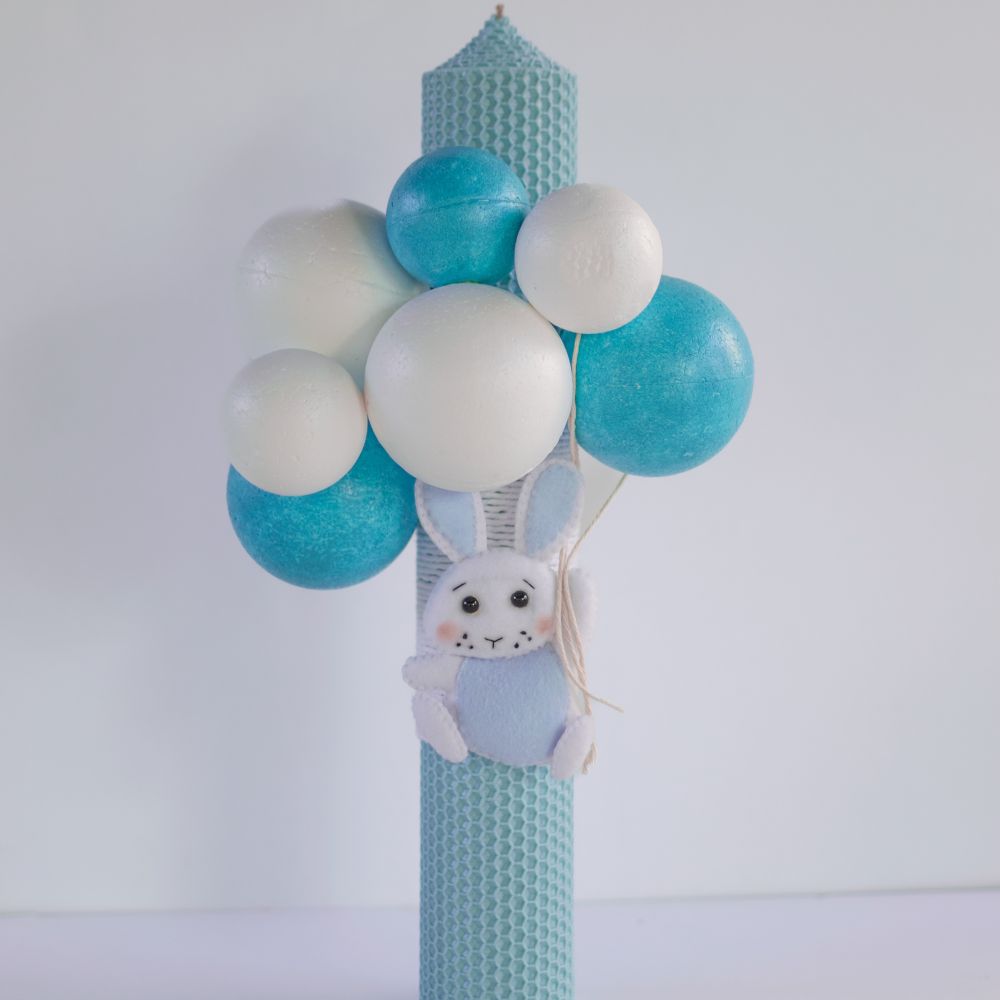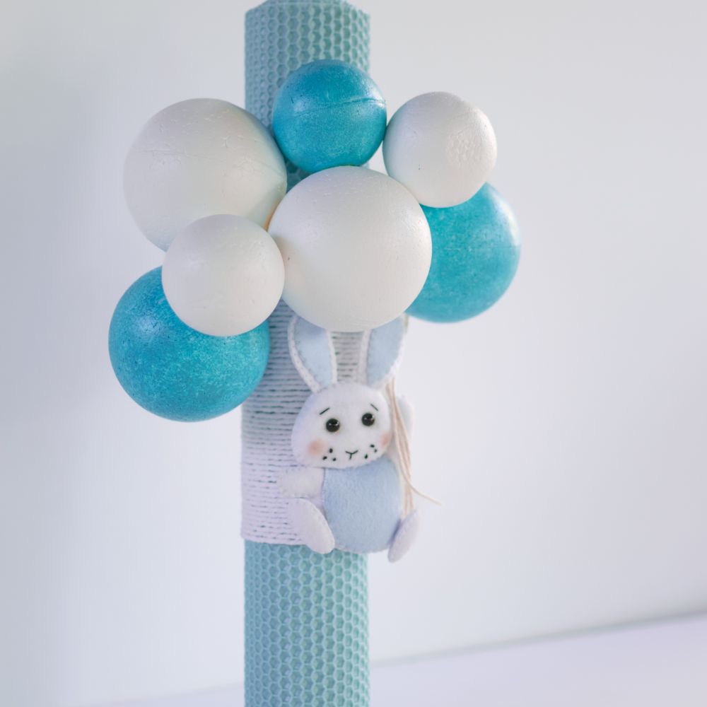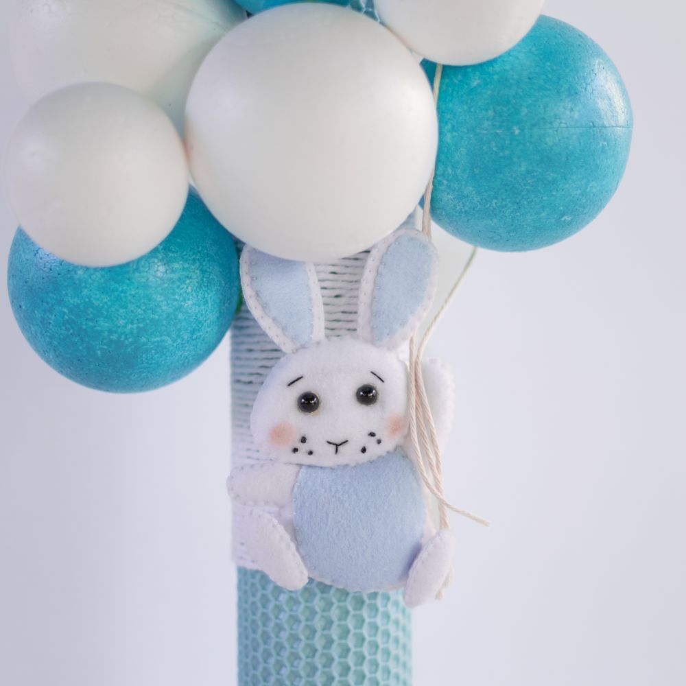 Vă prezentăm o lumânare de botez unică și elegantă, decorată manual pentru a aduce un plus de farmec ceremoniei de botez. Această lumânare specială este împodobită cu baloane colorate din polistiren și o jucărie adorabilă din fetru, oferindu-i un aspect autentic și rafinat.