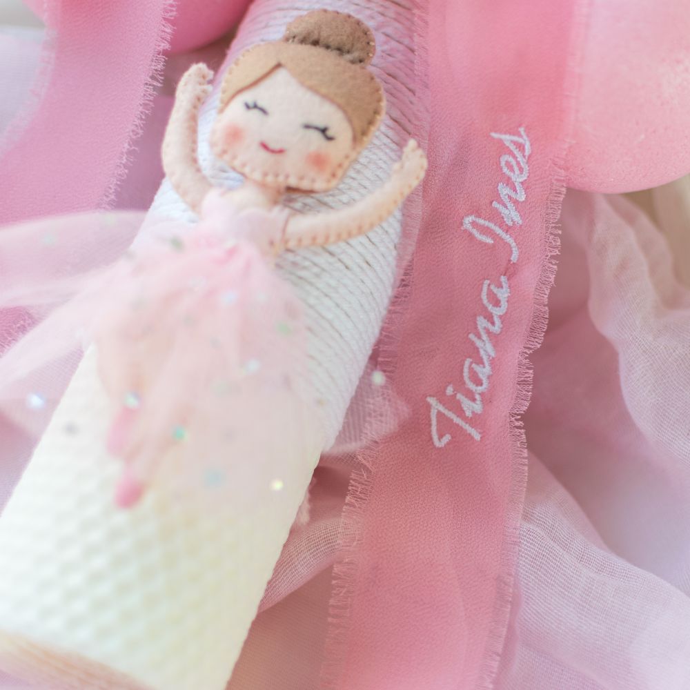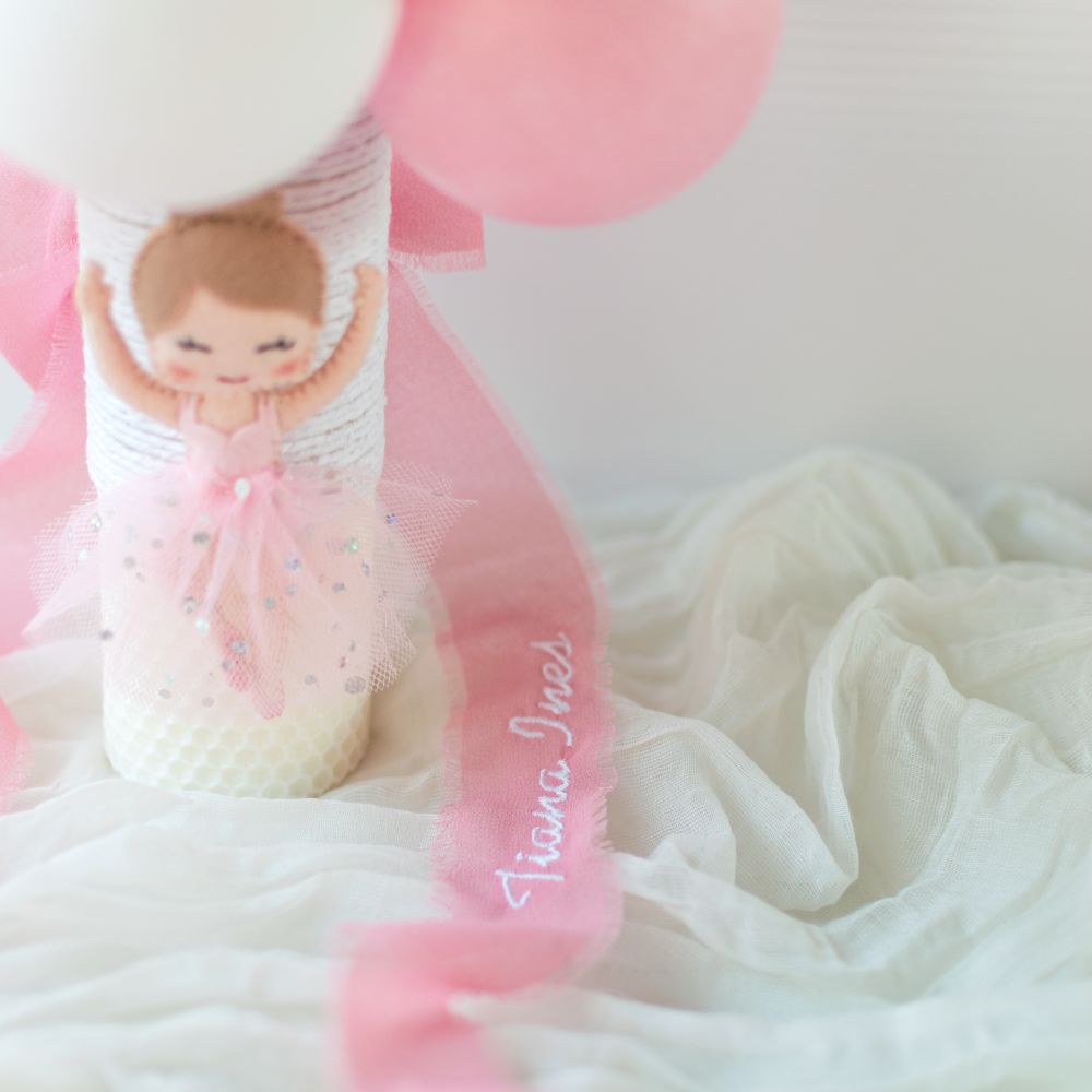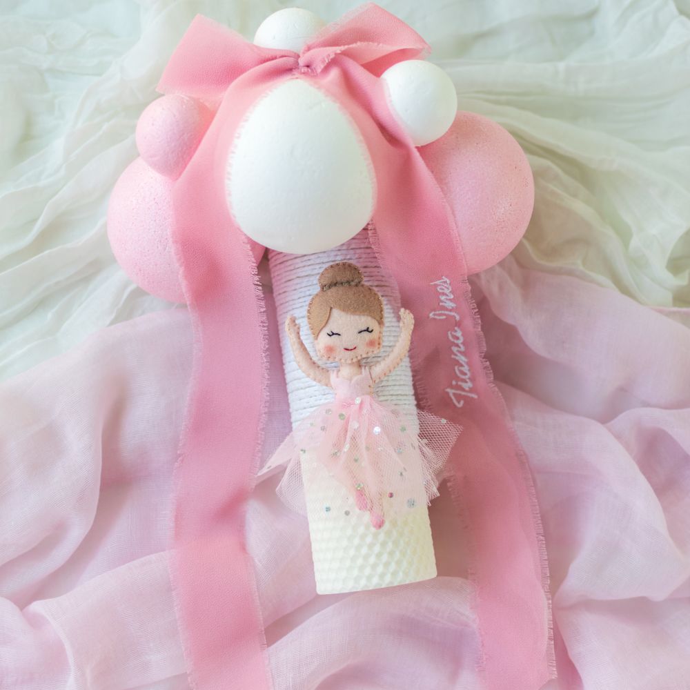 Pentru a celebra unicitatea fiecărui nou început, am dus povestea „Visului Balerinei” la un nivel și mai personal. Păstrând aceeași delicatețe și măiestrie artizanală, această versiune a lumânării este creată pentru a purta cu mândrie numele micuțului creștinat, brodat manual pe o panglică fină. Este mai mult decât o lumânare de botez; este o mărturie a identității, o amintire personalizată care va rămâne în inima familiei pentru totdeauna.
