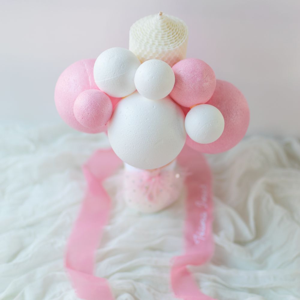 Materiale Decor: Fetru certificat EN-71, tulle, sferă polistiren, sfoară de bumbac, panglică din șifon personalizată prin broderie.