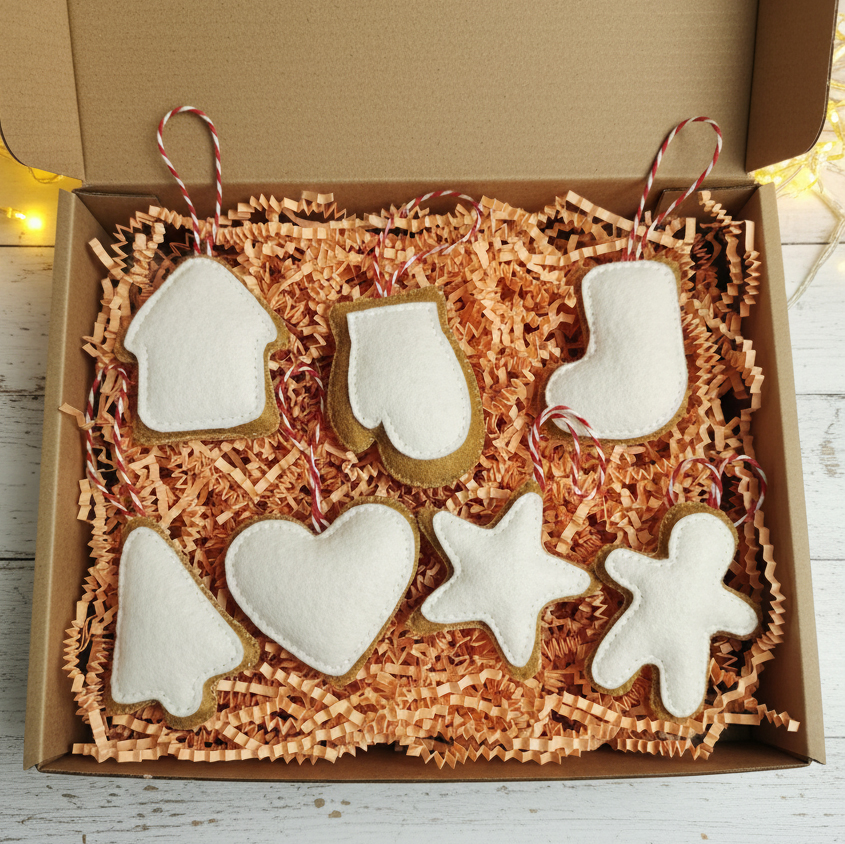 Inspirat de bucuria simplă a turtei dulci proaspăt scoase din cuptor, acest set de 7 ornamente aduce o atmosferă caldă și primitoare în decorul tău de Crăciun. Fiecare piesă este confecționată manual din fetru în două nuanțe, imitând perfect aspectul de „turtă dulce glazurată”.
